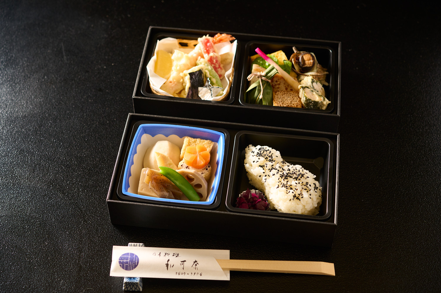 旬の味覚を美しく詰め込んだ、わかな特製の折詰松花堂弁当。
